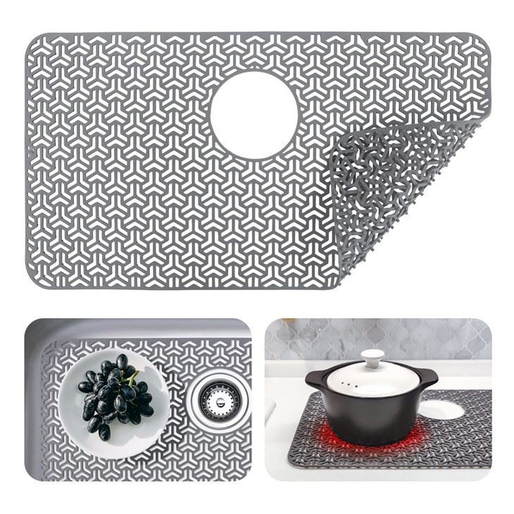 Το χαλάκι του νεροχύτη σιλικόνης είναι εύκαμπτο και αντισκωριακό. Μπορεί να αποτρέψει αποτελεσματικά το σπάσιμο των εύθραυστων επιτραπέζιων σκευών εάν πέσουν κατά λάθος στο νεροχύτη και αποφεύγει το ξύσιμο των ανοξείδωτων και κεραμικών νεροχυτών. Τα προστατευτικά νιπτήρα σιλικόνης για νεροχύτες κουζίνας είναι ανθεκτικά και δεν θα σκουριάσουν για να μολύνουν τον νεροχύτη.
